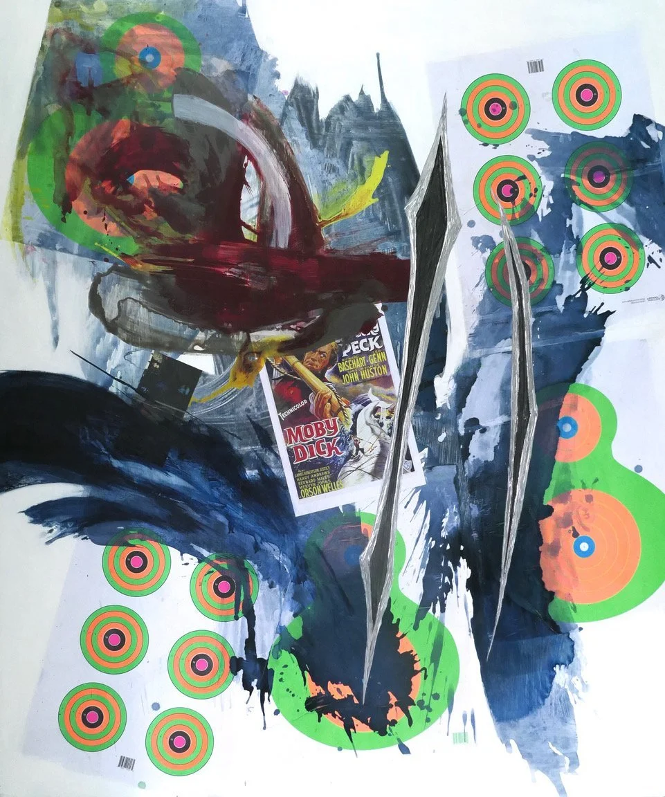 Ian Tee, THE WHITENESS OF THE WHALE, 2022, acrylic, target papers and collage on destroyed aluminium composite panel, 180 x 150cm. Image courtesy of the artist and Yavuz Gallery.