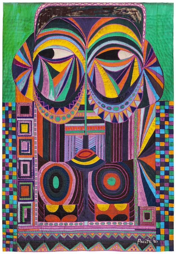 Pacita Abad, European Mask, 1990, acrylic paint, silkscreen and thread on canvas, 261.5 x 152.5cm. Collection of Tate Modern. Image courtesy the Pacita Abad Art Estate.