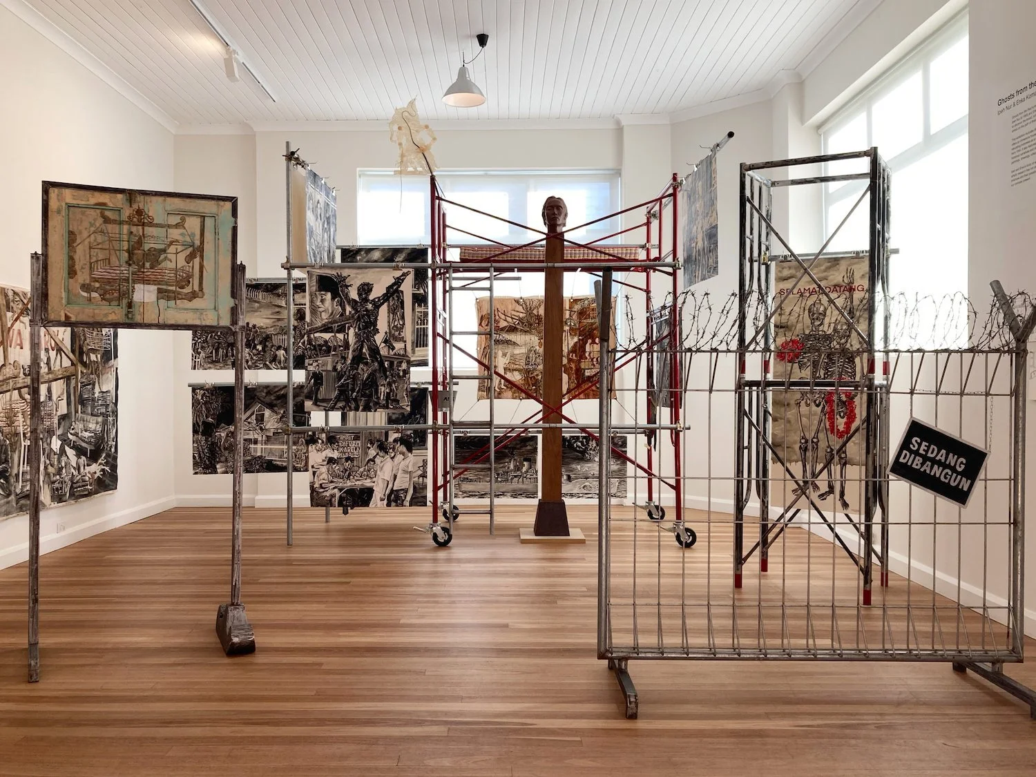 Australia-based 16albermarle Project Space opens Ghosts from the Past, featuring works by Yogyakarta artist couple Enka Komariah and Ipeh Nur. Through installations, drawings and paintings, the two grapple with disputed historical memories around post-independence Indonesia. The exhibition centres on a collaborative installation titled Rumah yang Yahud (A Cool House) (2022), which investigates the violence, speculation and absence of narratives in the building of Indonesia’s national identity. The show also features mixed-media paintings and a video work by Nur, who observes and reflects on the Pambusuang Mandar coastal community in West Sulawesi.