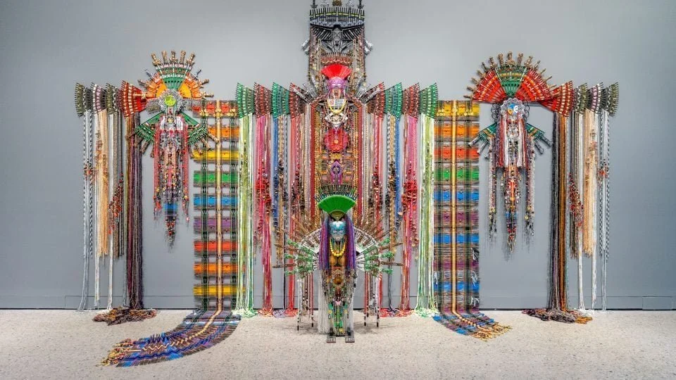 Anne Samat, Never Walk In Anyone’s Shadow, 2023, rattan sticks, kitchen and garden utensils, beads, ceramic, metal and plastic ornaments, 365.75 x 731.5 x 25.5 cm. Photo by Brian Holcombe. Image courtesy of the artist and Marc Straus, New York.