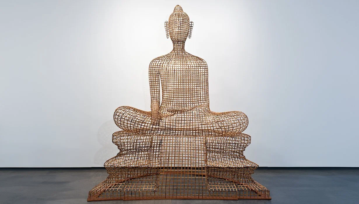 Sopheap Pich, Seated Buddha - Abhaya Mudra, 2012, bamboo, rattan, wire, plywood. Image courtesy of the artist and Tyler Rollins Fine Art. © Sopheap Pich.