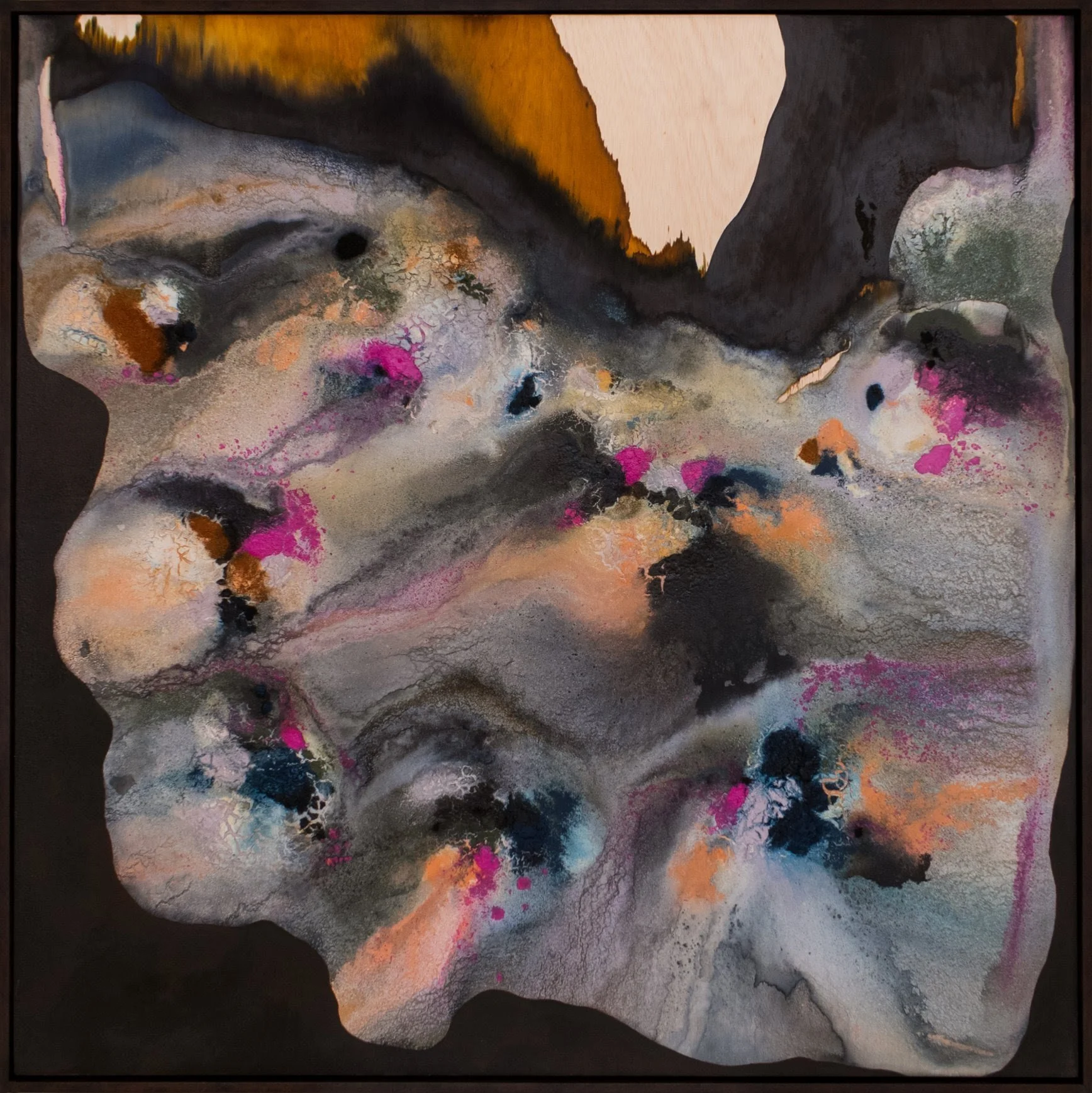 Dawn Ng, Volcano Blossoms, 2025, acrylic paint, dye and ink on wood, 123 x 123 x 5 cm. Image taken from sovereignartfoundation.com.