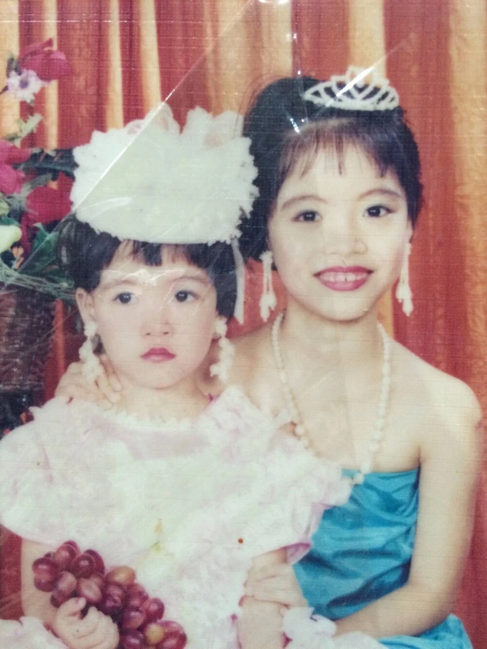 When flipping through the pages of our worn-out family album, I came across a portrait of my sister and me. It brought up vivid memories of a Sunday morning. I was around four, and my sister was nine. We clutched each other on the back of mom's bike as she pedaled through narrow alleys to a neighborhood studio. At home, she had put me in my best ruffle dress and painted our lips red with the same lipstick she wore every day to work. A lady there had my sister slip on a piece of fabric with clips on the back to give off the impression of a tube dress. The photographer must have told us to smile for the camera.