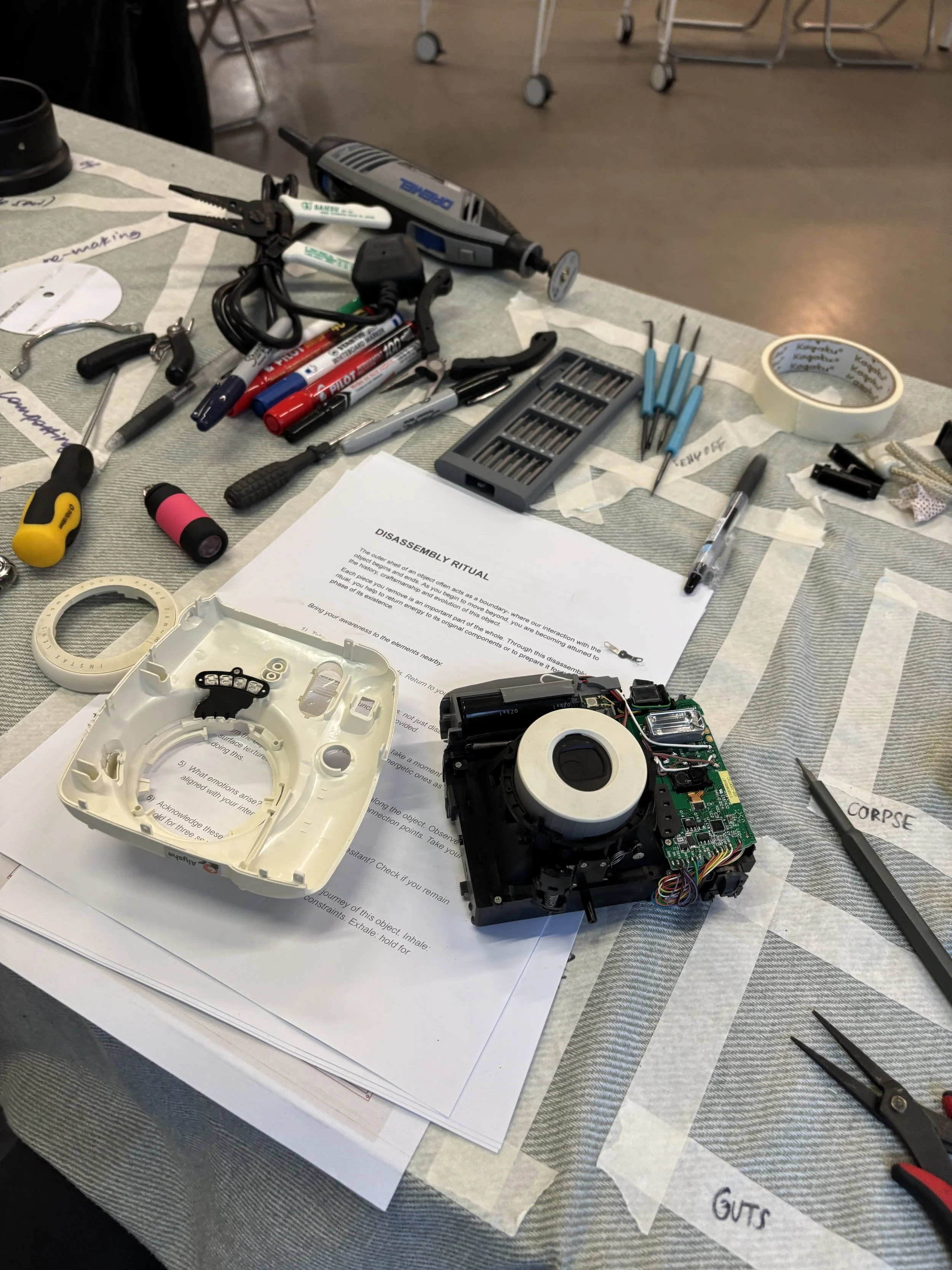I chose to turn my long-broken Fujifilm Instax camera, that had once catalogued countless teenage memories, into a talisman of eternal youth. As pine resin incense wafted through the workshop space, I picked up a soldering iron for the first time, and was delighted to discover the mess of miniature metal screws, plastic cogs and circuitry concealed within the casing of the camera. Other participants brought along broken speakers, computer mouses and portable fans. An alarm clock was transformed into a talisman for rest, a printer was remade into a talisman for the written word. We took these devices apart without the pressure of putting them back together. In so doing, we honoured the work they had done for us without expecting that work to continue.