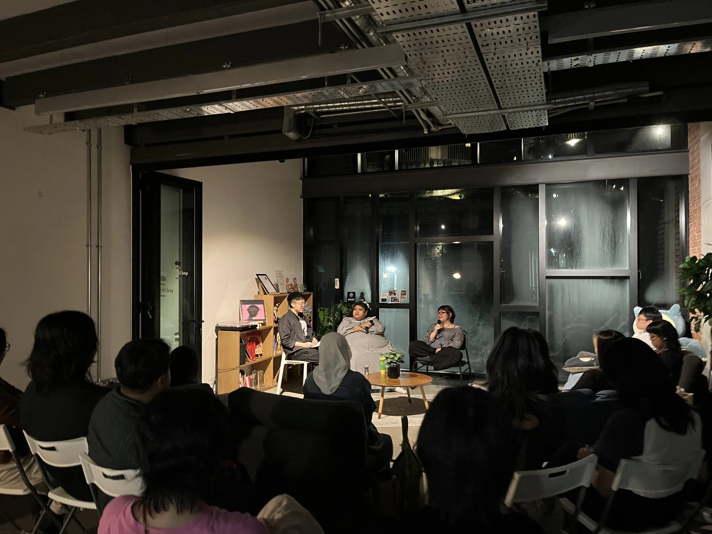 ants chua, Jasmine See and Aida Nurellysa in conversation as part of the programme How To Go On, 27 March 2025, Potato Productions Office. Photo by Azure Chaya.