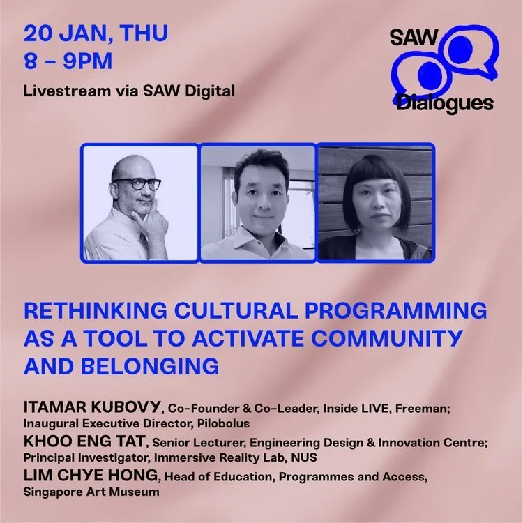 Join Itamar Kubovy, Khoo Eng Tat, and Lim Chye Hong as they share their experiences in navigating the digital realms to optimize live, five-senses, and in-person experience. The key focus being, how to rethink cultural programming as a primary tool to activate a sense of community, trust, and belonging.